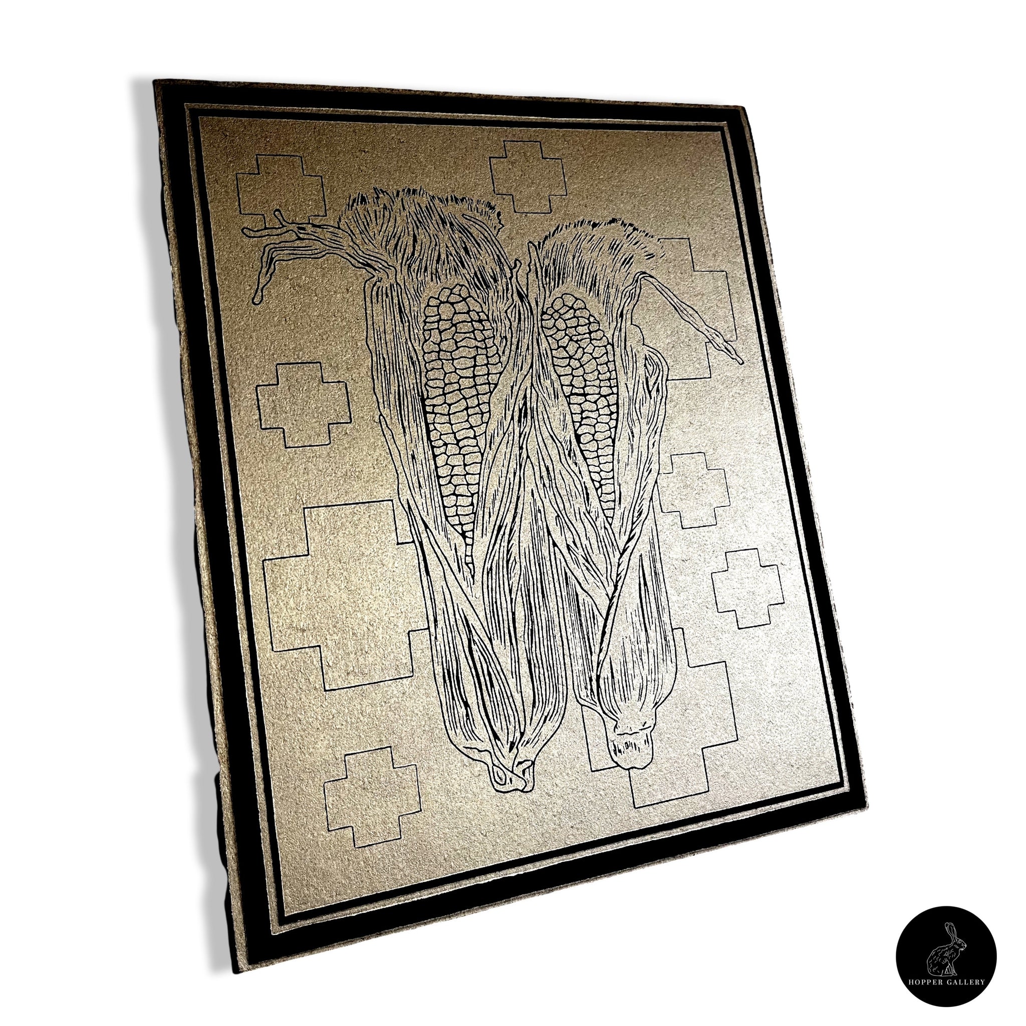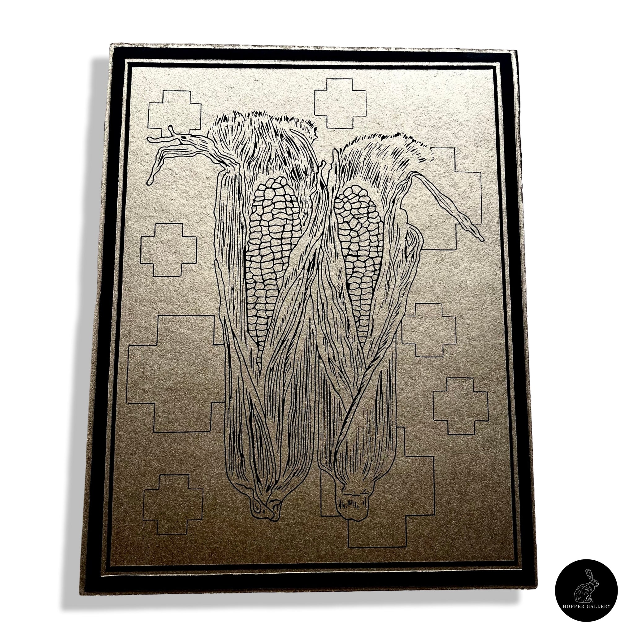 This print is all about the love of corn, kinship, how sacred corn is to our native peoples’ and beyond. Corn is beautiful. And incorporating the four directions (cardinal symbol) balances out this art piece in harmony. Growing up I would hear stories about corn in our ceremonies, story tellings from our elders and used for everyday life.